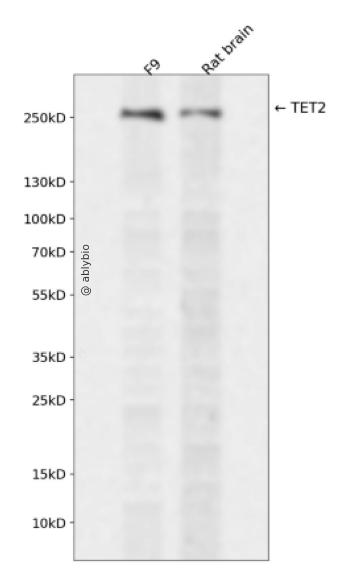 Western blot analysis of TET2 expressed in F9,Rat brain using TET2 Rabbit pAb at 1:1000. Secondary antibody: HRP Goat Anti-Rabbit IgG (H+L) at 1:5000. Lysates/proteins: 30ug per lane. Blocking buffer: 5% non-fat dry milk in TBST. Detection: ECL Enhanced Kit. Exposure time: 120s.