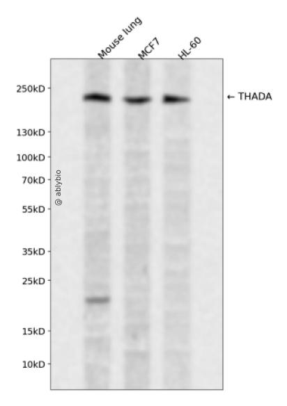 Western blot analysis of THADA expressed in Mouse lung,MCF7,HL-60 using THADA Rabbit pAb at 1:1000. Secondary antibody: HRP Goat Anti-Rabbit IgG (H+L) at 1:5000. Lysates/proteins: 30ug per lane. Blocking buffer: 5% non-fat dry milk in TBST. Detection: ECL Enhanced Kit. Exposure time: 120s.