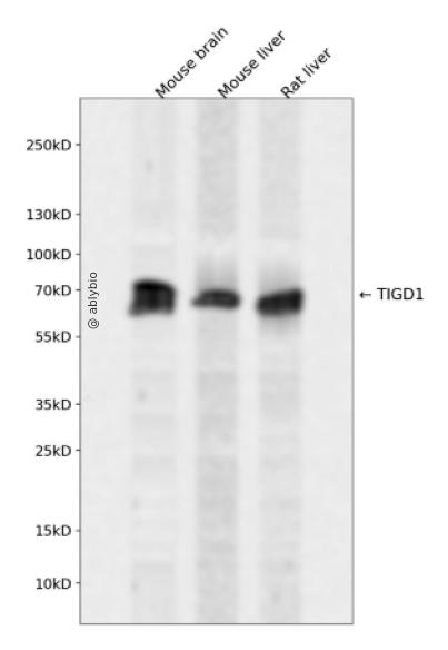 Western blot analysis of TIGD1 expressed in Mouse brain,Mouse liver,Rat liver using TIGD1 Rabbit pAb at 1:1000. Secondary antibody: HRP Goat Anti-Rabbit IgG (H+L) at 1:5000. Lysates/proteins: 30ug per lane. Blocking buffer: 5% non-fat dry milk in TBST. Detection: ECL Enhanced Kit. Exposure time: 120s.