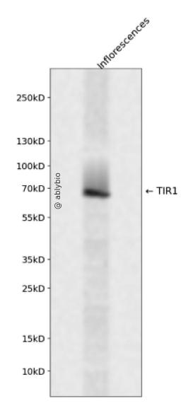 Western blot analysis of TIR1 expressed in Inflorescences using TIR1 Rabbit pAb at 1:1000. Secondary antibody: HRP Goat Anti-Rabbit IgG (H+L) at 1:5000. Lysates/proteins: 30ug per lane. Blocking buffer: 5% non-fat dry milk in TBST. Detection: ECL Enhanced Kit. Exposure time: 120s.