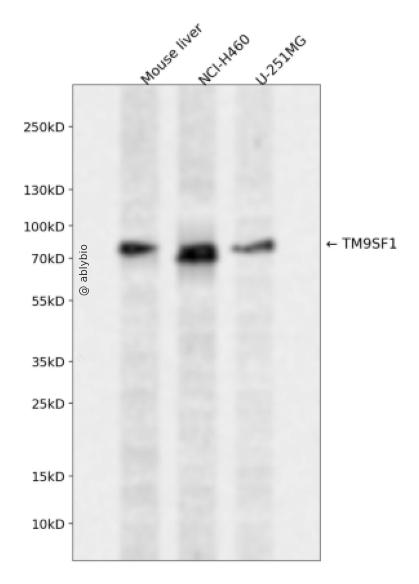 Western blot analysis of TM9SF1 expressed in Mouse liver,NCI-H460,U-251MG using TM9SF1 Rabbit pAb at 1:1000. Secondary antibody: HRP Goat Anti-Rabbit IgG (H+L) at 1:5000. Lysates/proteins: 30ug per lane. Blocking buffer: 5% non-fat dry milk in TBST. Detection: ECL Enhanced Kit. Exposure time: 120s.