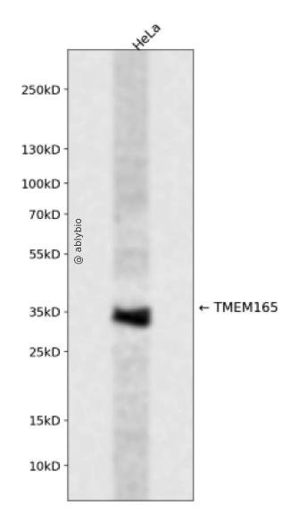 Western blot analysis of TMEM165 expressed in HeLa using TMEM165 Rabbit pAb at 1:1000. Secondary antibody: HRP Goat Anti-Rabbit IgG (H+L) at 1:5000. Lysates/proteins: 30ug per lane. Blocking buffer: 5% non-fat dry milk in TBST. Detection: ECL Enhanced Kit. Exposure time: 120s.