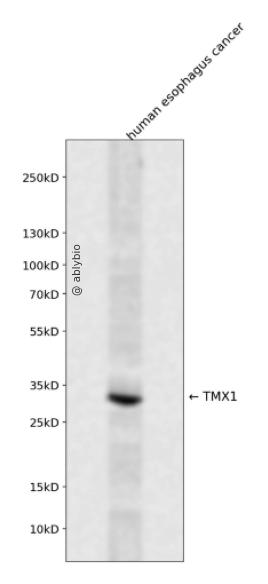 Western blot analysis of TMX1 expressed in human esophagus cancer using TMX1 Rabbit pAb at 1:1000. Secondary antibody: HRP Goat Anti-Rabbit IgG (H+L) at 1:5000. Lysates/proteins: 30ug per lane. Blocking buffer: 5% non-fat dry milk in TBST. Detection: ECL Enhanced Kit. Exposure time: 120s.