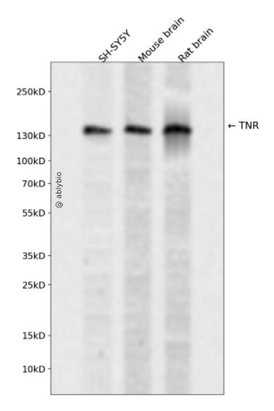 Western blot analysis of TNR expressed in SH-SY5Y,Mouse brain,Rat brain using TNR Rabbit pAb at 1:1000. Secondary antibody: HRP Goat Anti-Rabbit IgG (H+L) at 1:5000. Lysates/proteins: 30ug per lane. Blocking buffer: 5% non-fat dry milk in TBST. Detection: ECL Enhanced Kit. Exposure time: 120s.