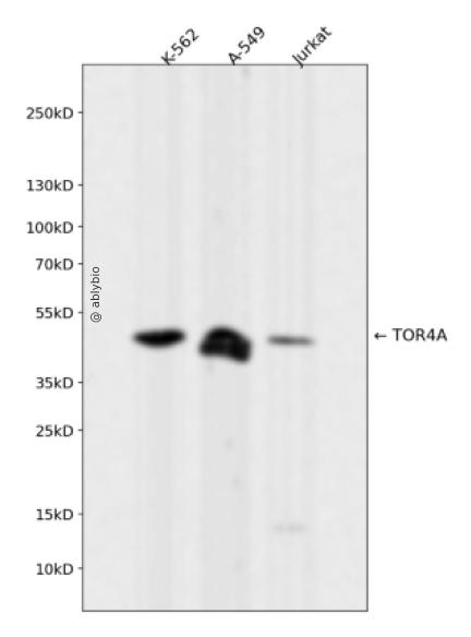 Western blot analysis of TOR4A expressed in K-562,A-549,Jurkat using TOR4A Rabbit mAb at 1:1000. Secondary antibody: HRP Goat Anti-Rabbit IgG (H+L) at 1:5000. Lysates/proteins: 30ug per lane. Blocking buffer: 5% non-fat dry milk in TBST. Detection: ECL Enhanced Kit. Exposure time: 120s.