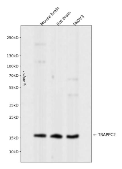 Western blot analysis of TRAPPC2 expressed in Mouse brain,Rat brain,SKOV3 using TRAPPC2 Rabbit mAb at 1:1000. Secondary antibody: HRP Goat Anti-Rabbit IgG (H+L) at 1:5000. Lysates/proteins: 30ug per lane. Blocking buffer: 5% non-fat dry milk in TBST. Detection: ECL Enhanced Kit. Exposure time: 120s.