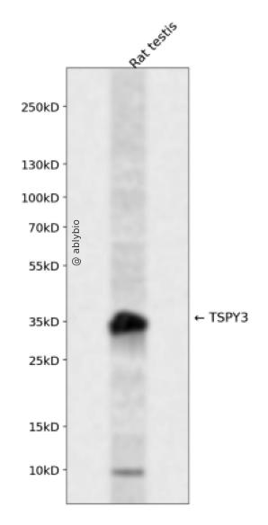 Western blot analysis of TSPY3 expressed in Rat testis using TSPY3 Rabbit pAb at 1:1000. Secondary antibody: HRP Goat Anti-Rabbit IgG (H+L) at 1:5000. Lysates/proteins: 30ug per lane. Blocking buffer: 5% non-fat dry milk in TBST. Detection: ECL Enhanced Kit. Exposure time: 120s.