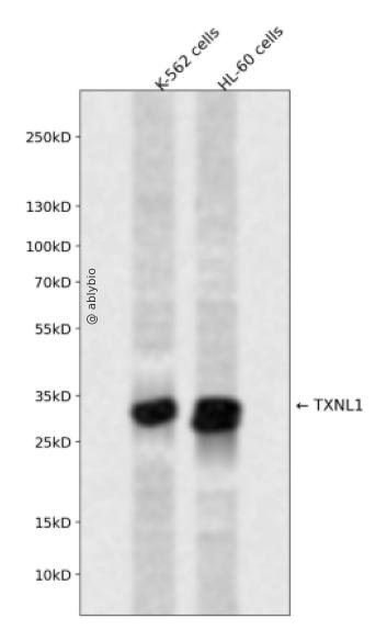Western blot analysis of TXNL1 expressed in K-562 cells,HL-60 cells using TXNL1 Rabbit pAb at 1:1000. Secondary antibody: HRP Goat Anti-Rabbit IgG (H+L) at 1:5000. Lysates/proteins: 30ug per lane. Blocking buffer: 5% non-fat dry milk in TBST. Detection: ECL Enhanced Kit. Exposure time: 120s.