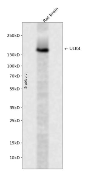 Western blot analysis of ULK4 expressed in Rat brain using ULK4 Rabbit pAb at 1:1000. Secondary antibody: HRP Goat Anti-Rabbit IgG (H+L) at 1:5000. Lysates/proteins: 30ug per lane. Blocking buffer: 5% non-fat dry milk in TBST. Detection: ECL Enhanced Kit. Exposure time: 120s.