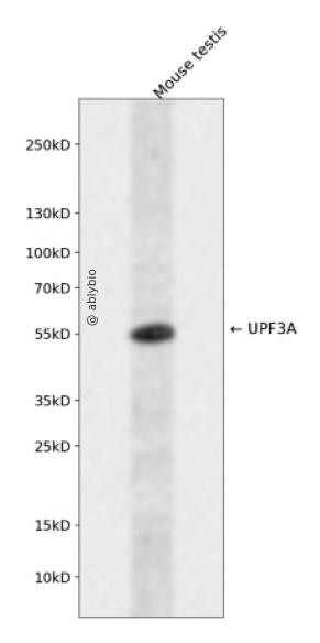 Western blot analysis of UPF3A expressed in Mouse testis using UPF3A Rabbit pAb at 1:1000. Secondary antibody: HRP Goat Anti-Rabbit IgG (H+L) at 1:5000. Lysates/proteins: 30ug per lane. Blocking buffer: 5% non-fat dry milk in TBST. Detection: ECL Enhanced Kit. Exposure time: 120s.