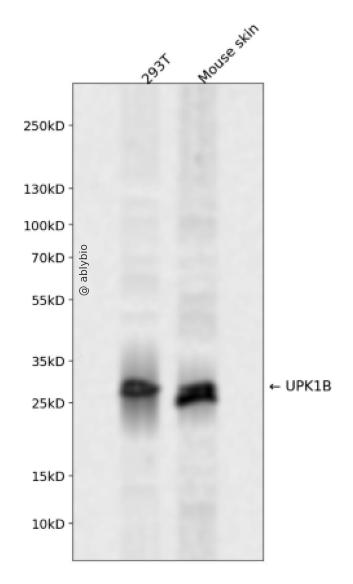 Western blot analysis of UPK1B expressed in 293T,Mouse skin using UPK1B Rabbit pAb at 1:1000. Secondary antibody: HRP Goat Anti-Rabbit IgG (H+L) at 1:5000. Lysates/proteins: 30ug per lane. Blocking buffer: 5% non-fat dry milk in TBST. Detection: ECL Enhanced Kit. Exposure time: 120s.