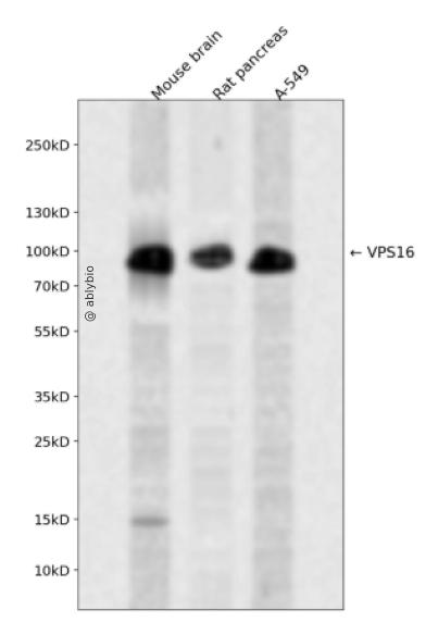 Western blot analysis of VPS16 expressed in Mouse brain,Rat pancreas,A-549 using VPS16 Rabbit pAb at 1:1000. Secondary antibody: HRP Goat Anti-Rabbit IgG (H+L) at 1:5000. Lysates/proteins: 30ug per lane. Blocking buffer: 5% non-fat dry milk in TBST. Detection: ECL Enhanced Kit. Exposure time: 120s.