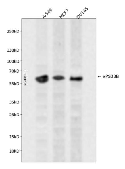 Western blot analysis of VPS33B expressed in A-549,MCF7,DU145 using VPS33B Rabbit pAb at 1:1000. Secondary antibody: HRP Goat Anti-Rabbit IgG (H+L) at 1:5000. Lysates/proteins: 30ug per lane. Blocking buffer: 5% non-fat dry milk in TBST. Detection: ECL Enhanced Kit. Exposure time: 120s.