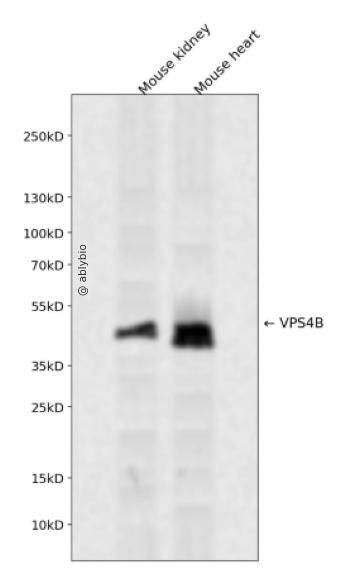 Western blot analysis of VPS4B expressed in Mouse kidney,Mouse heart using VPS4B Rabbit pAb at 1:1000. Secondary antibody: HRP Goat Anti-Rabbit IgG (H+L) at 1:5000. Lysates/proteins: 30ug per lane. Blocking buffer: 5% non-fat dry milk in TBST. Detection: ECL Enhanced Kit. Exposure time: 120s.
