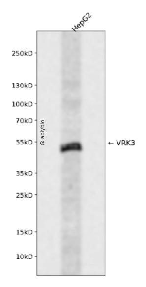 Western blot analysis of VRK3 expressed in HepG2 using VRK3 Rabbit pAb at 1:1000. Secondary antibody: HRP Goat Anti-Rabbit IgG (H+L) at 1:5000. Lysates/proteins: 30ug per lane. Blocking buffer: 5% non-fat dry milk in TBST. Detection: ECL Enhanced Kit. Exposure time: 120s.