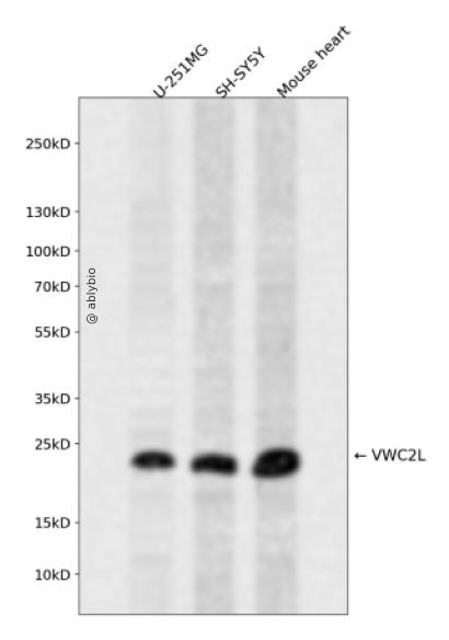 Western blot analysis of VWC2L expressed in U-251MG,SH-SY5Y,Mouse heart using VWC2L Rabbit pAb at 1:1000. Secondary antibody: HRP Goat Anti-Rabbit IgG (H+L) at 1:5000. Lysates/proteins: 30ug per lane. Blocking buffer: 5% non-fat dry milk in TBST. Detection: ECL Enhanced Kit. Exposure time: 120s.