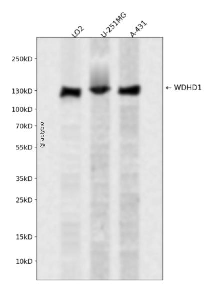Western blot analysis of WDHD1 expressed in LO2,U-251MG,A-431 using WDHD1 Rabbit pAb at 1:1000. Secondary antibody: HRP Goat Anti-Rabbit IgG (H+L) at 1:5000. Lysates/proteins: 30ug per lane. Blocking buffer: 5% non-fat dry milk in TBST. Detection: ECL Enhanced Kit. Exposure time: 120s.