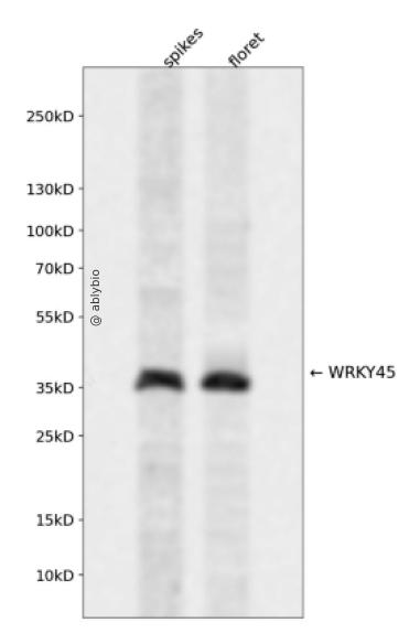 Western blot analysis of WRKY45 expressed in spikes,floret using WRKY45 Rabbit pAb at 1:1000. Secondary antibody: HRP Goat Anti-Rabbit IgG (H+L) at 1:5000. Lysates/proteins: 30ug per lane. Blocking buffer: 5% non-fat dry milk in TBST. Detection: ECL Enhanced Kit. Exposure time: 120s.