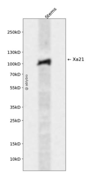Western blot analysis of Xa21 expressed in Stems using Xa21 Rabbit pAb at 1:1000. Secondary antibody: HRP Goat Anti-Rabbit IgG (H+L) at 1:5000. Lysates/proteins: 30ug per lane. Blocking buffer: 5% non-fat dry milk in TBST. Detection: ECL Enhanced Kit. Exposure time: 120s.