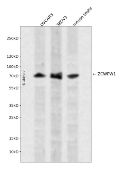 Western blot analysis of ZCWPW1 expressed in OVCAR3,SKOV3,mouse testis using ZCWPW1 Rabbit pAb at 1:1000. Secondary antibody: HRP Goat Anti-Rabbit IgG (H+L) at 1:5000. Lysates/proteins: 30ug per lane. Blocking buffer: 5% non-fat dry milk in TBST. Detection: ECL Enhanced Kit. Exposure time: 120s.
