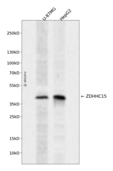 Western blot analysis of ZDHHC15 expressed in U-87MG,HepG2 using ZDHHC15 Rabbit pAb at 1:1000. Secondary antibody: HRP Goat Anti-Rabbit IgG (H+L) at 1:5000. Lysates/proteins: 30ug per lane. Blocking buffer: 5% non-fat dry milk in TBST. Detection: ECL Enhanced Kit. Exposure time: 120s.