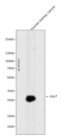 Western blot analysis of cbx7 expressed in human kidney cancer using cbx7 Rabbit mAb at 1:1000. Secondary antibody: HRP Goat Anti-Rabbit IgG (H+L) at 1:5000. Lysates/proteins: 30ug per lane. Blocking buffer: 5% non-fat dry milk in TBST. Detection: ECL Enhanced Kit. Exposure time: 120s.