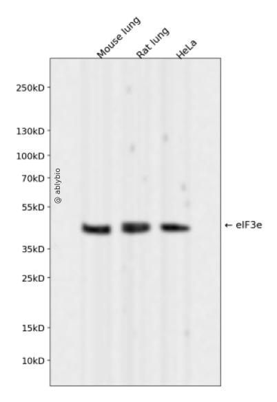 Western blot analysis of eIF3e expressed in Mouse lung,Rat lung,HeLa using eIF3e Rabbit mAb at 1:1000. Secondary antibody: HRP Goat Anti-Rabbit IgG (H+L) at 1:5000. Lysates/proteins: 30ug per lane. Blocking buffer: 5% non-fat dry milk in TBST. Detection: ECL Enhanced Kit. Exposure time: 120s.