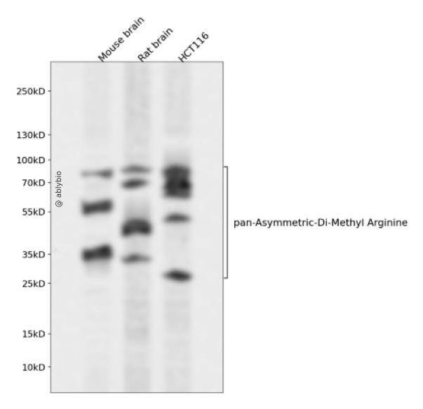 Western blot analysis of pan-Asymmetric-Di-Methyl Arginine expressed in Mouse brain,Rat brain,HCT116 using pan-Asymmetric-Di-Methyl Arginine Rabbit pAb at 1:1000. Secondary antibody: HRP Goat Anti-Rabbit IgG (H+L) at 1:5000. Lysates/proteins: 30ug per lane. Blocking buffer: 5% non-fat dry milk in TBST. Detection: ECL Enhanced Kit. Exposure time: 120s.