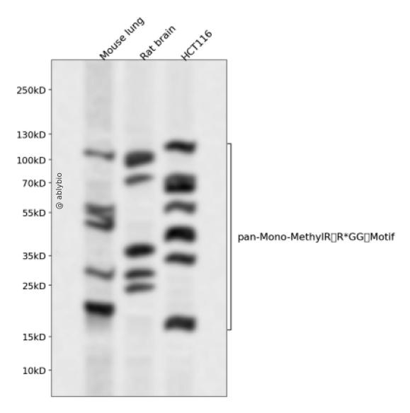 Western blot analysis of pan-Mono-MethylR(R*GG)Motif expressed in Mouse lung,Rat brain,HCT116 using pan-Mono-MethylR(R*GG)Motif Rabbit pAb at 1:1000. Secondary antibody: HRP Goat Anti-Rabbit IgG (H+L) at 1:5000. Lysates/proteins: 30ug per lane. Blocking buffer: 5% non-fat dry milk in TBST. Detection: ECL Enhanced Kit. Exposure time: 120s.